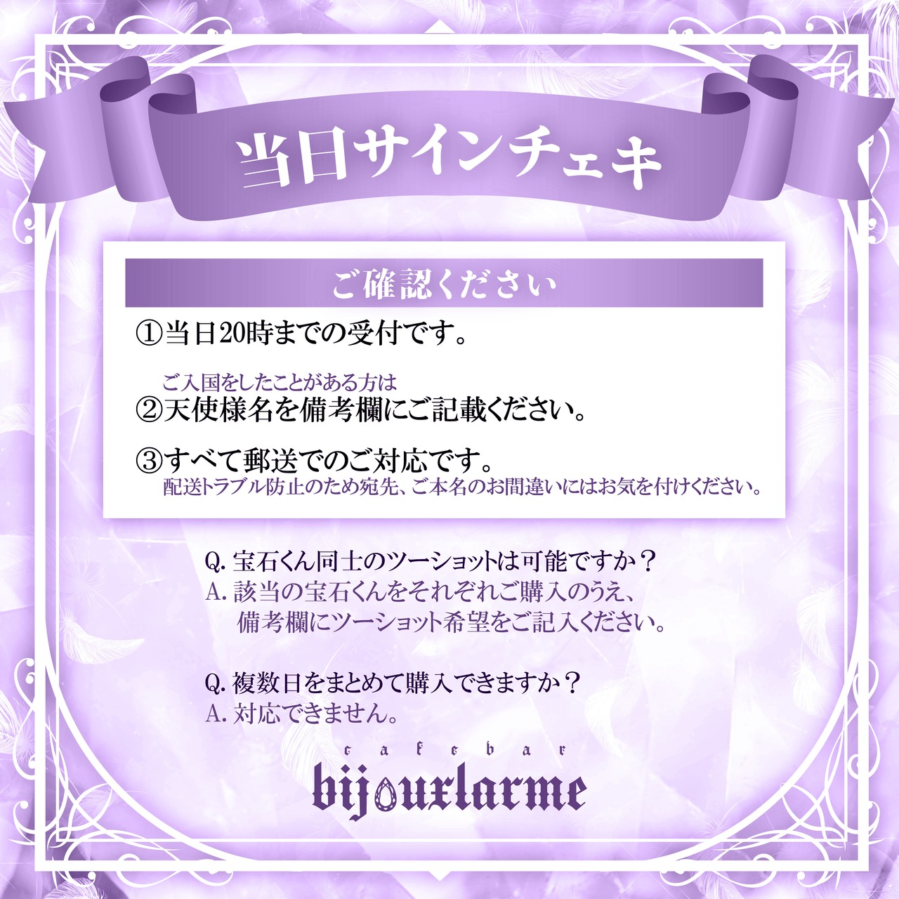 ※チェキ等サイン、デコが必要なものに関しましてはキャストの出勤日により発送まで2,3週間以上頂く場合もございます。不要の際はご購入時にメッセージよりご連絡ください。